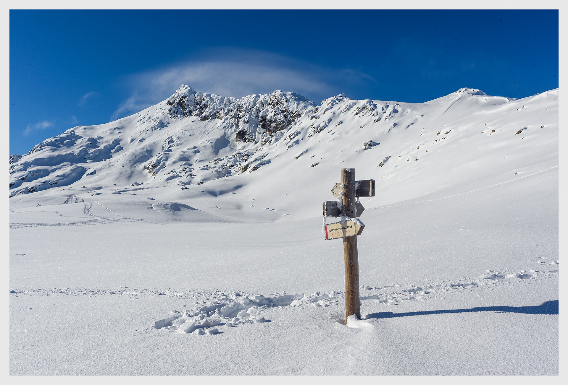 Retomando la sana costumbre de llevar una cámara para fotografiar de verdad. El Risco de los Claveles es una hito alpino dentro del Parque Nacional de la Sierra de Guadarrama. Es la segunda cumbre con 2387 m detrás del Peñalara 2427)pero su principal atractivo para los montañeros es la estrechez de su paso, hecho solo para quien no sabe lo que es el vertigo. Dudé poner otra imagen sin el poste. Pero al fin y al cabo es un lugar bastante frecuentado y el elemento humano es muy bastante evidente sobre todo en verano donde hay balizas, puentes y señales de no pisar, así que me ha parecido que incluir el poste es un recordatorio de que aunque es un sitio de montaña y las nevadas ha borrado cualquier traza "humana", el lugar está bastante transitado.