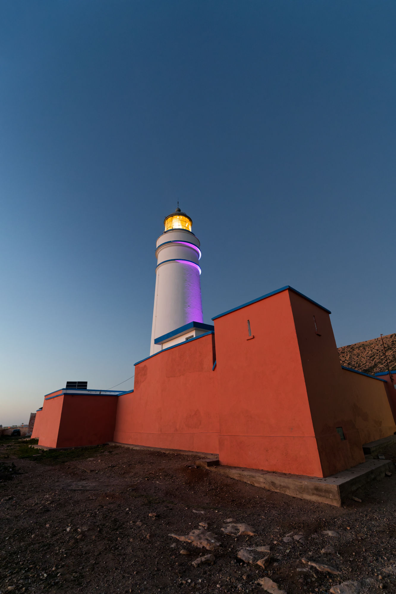 El edificio se construyó en 1926 y está equipado con una lente Fresnel alimentada con energía solar que emite un haz blanco visible a 40 km.