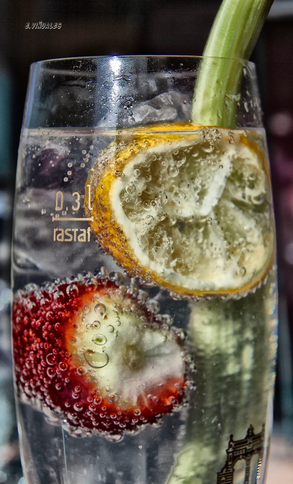 La composición regular, el encuadre coge zonas externas desenfocadas pero sin ningún interés, oscuras a la derecha y claras a la izquierda, eso despista. También despista el elemento verde, no se identifica, no se aprecia su utilidad y su color aporta confusión más que otra cosa. Sobran las inscripciones en el vaso, sobre todo la negra de abajo, es horrible.