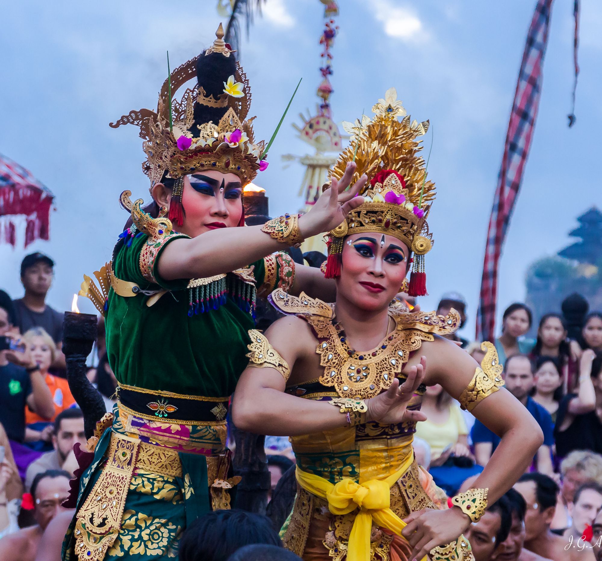 Os dejo la que creo que es mi primera aportación a este foro. Esta foto fue tomada en Bali (Indonesia), concretamente en el templo de Uluwatu al suroeste de la isla. El templo está situado en un escarpe de unos 150 metros de altura (calcule a ojo) y en el recinto se encuentra un anfiteatro con una capacidad para unas 500 personas en el que diariamente y coincidiendo con el ocaso se realiza una exhibición de Kecac Dance.
