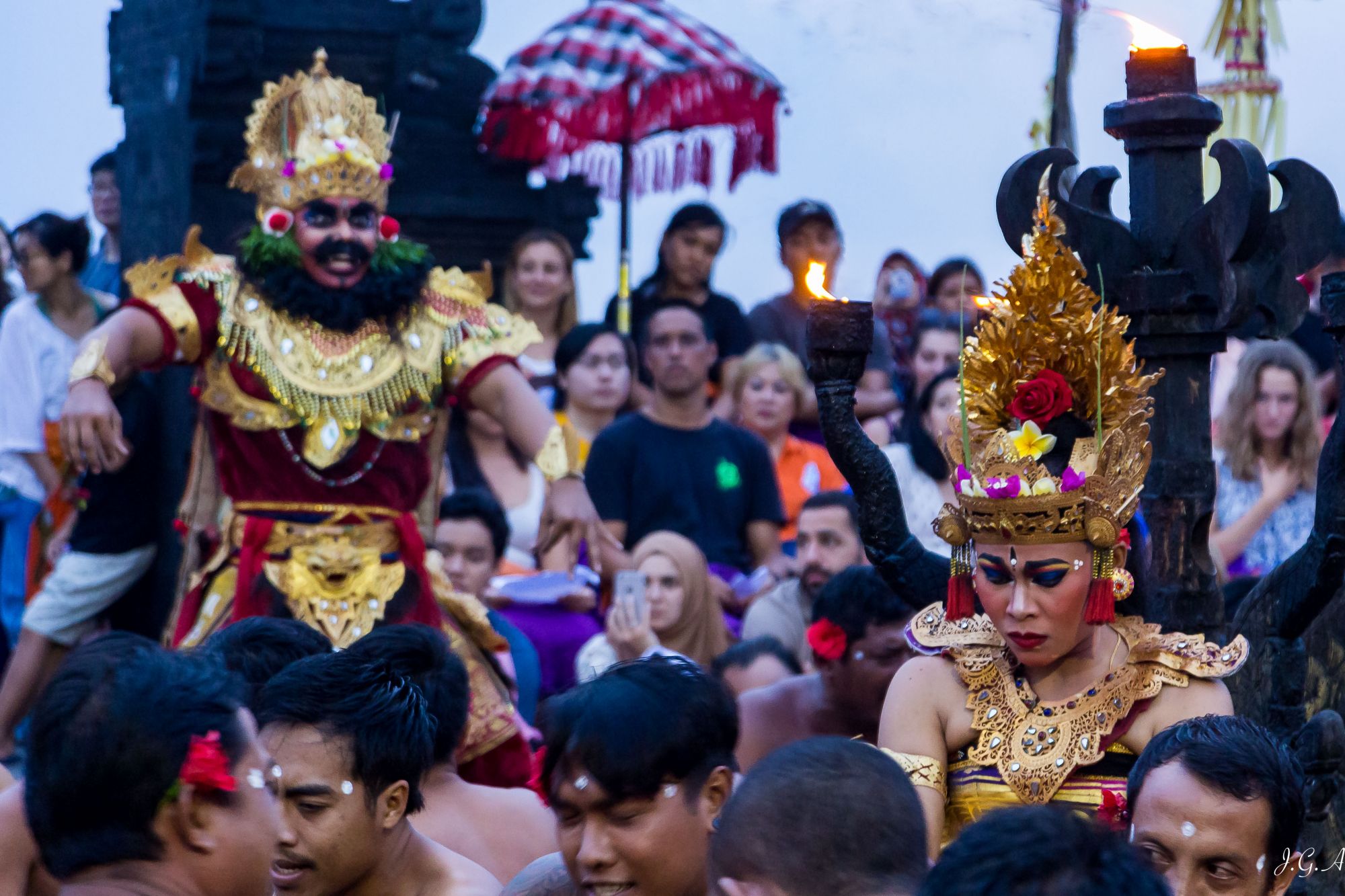 La historia que representa es un poco liosa y complicada, y si ya te la explican en "chininglish" puede resultar desastroso. De todas formas para los curiosos lo podéis consultar en Wikipedia. Lo más destacable de esta danza, es el coro. Un coro de unos 50 hombres que lo que representan son los monos que acompañan a los protagonistas en su exilio en el bosque, no os puedo describir el sonido con palabras, pero es espectacular.
