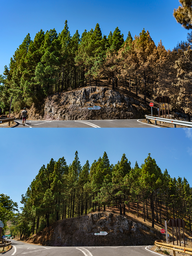 Tuve la ocasión de fotografiar la curiosidad de esta curva después del incendio en 2019 del P. N. de Tamadaba, en la isla de Gran Canaria, 1 año después es increíble la evolución y pura magia de la naturaleza con el pino canario, que bonita lección para los humanos, renacer de entre las cenizas con esa fuerza extraordinaria, una lección de vida.