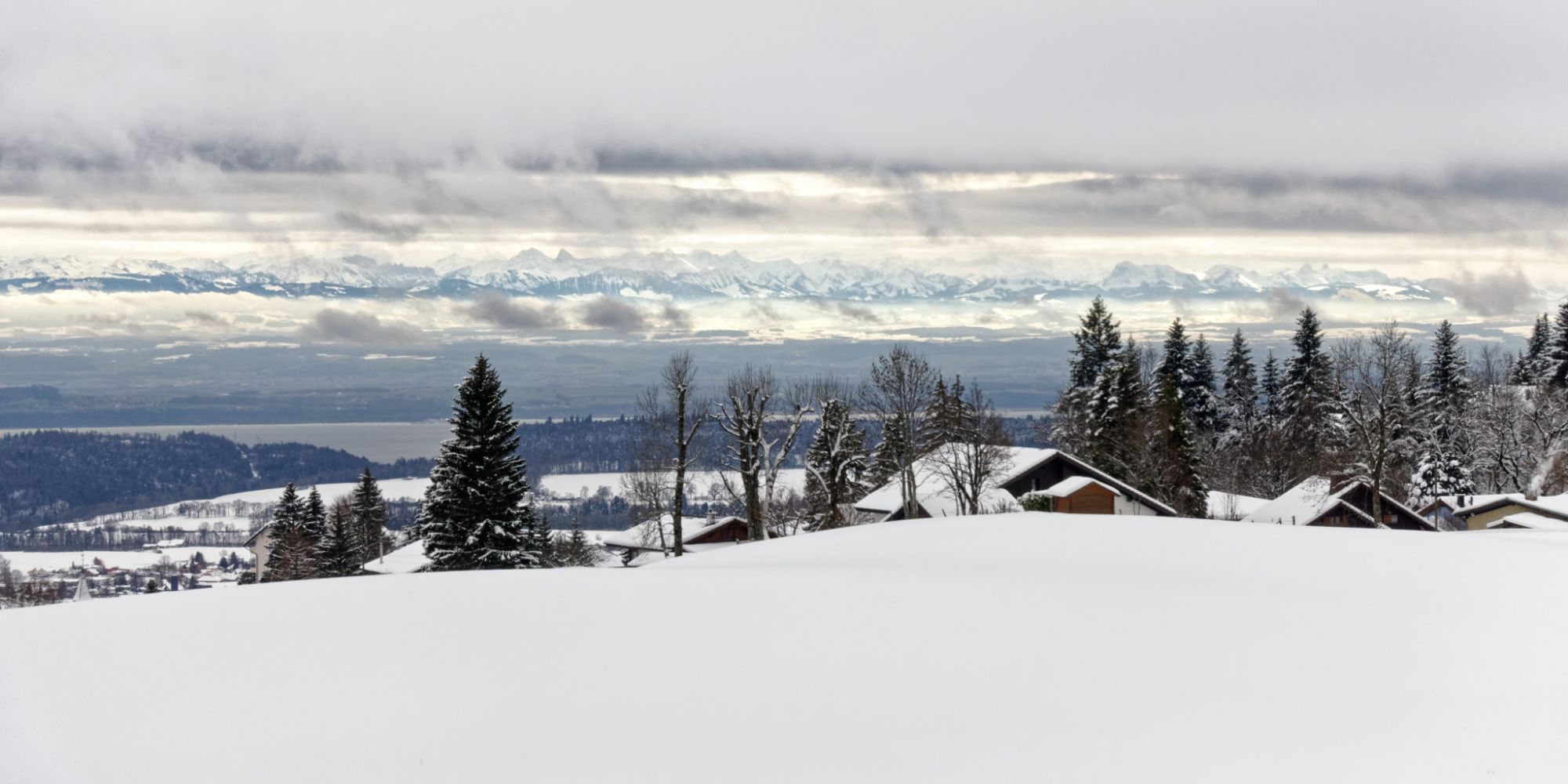 En esta toma vemos al primer plano el pueblo de ‘’Les Hauts Geneveys’’ en el Jura, luego el lago de Neuchâtel, la meseta suiza y al fondo los Alpes.