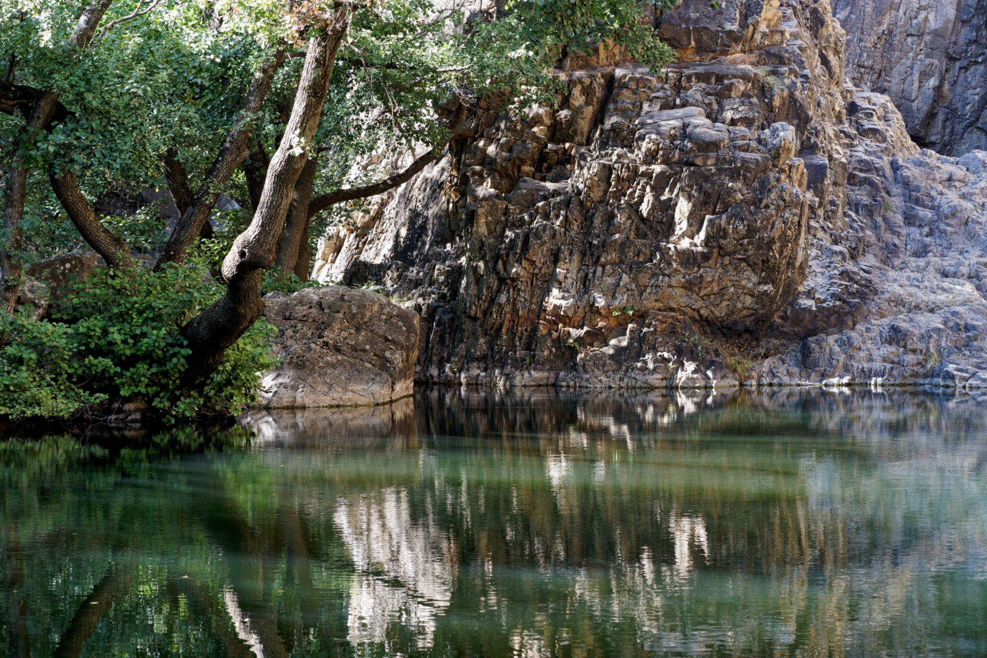 Un lugar idílico situado en aval de las cascadas de la Cimbarra, en la corriente del Rio Guarrizas. A esta época del año, la cascada (a la derecha) esta seca, pero este lugar de difícil acceso sigue atractivo por su abundante vegetación y los bonitos reflejos del lago.