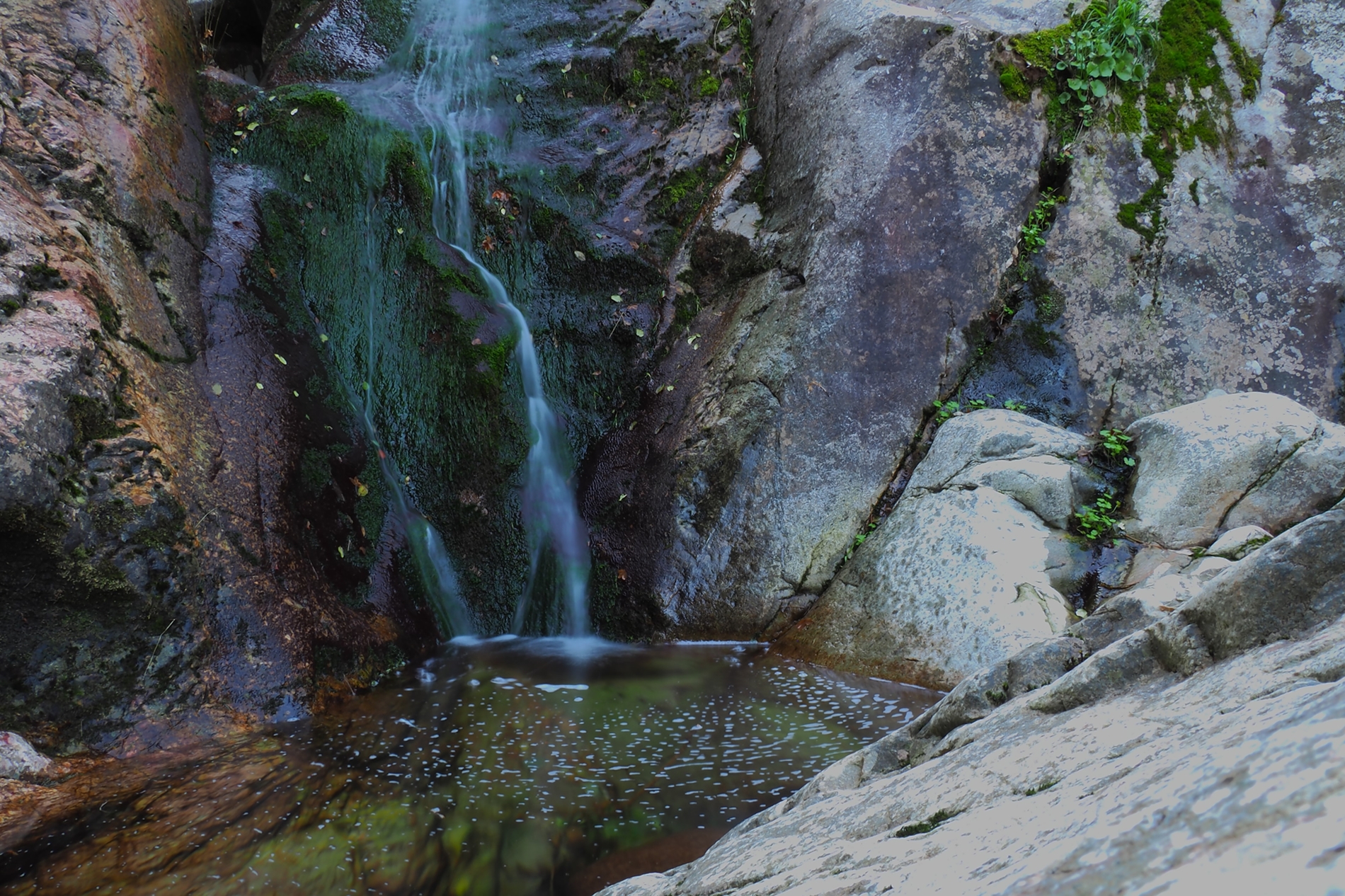 En los Montes de Toledo en el término de Navahermosa se encuentra la Hoz del Carbonero. Muy a lo alto el tiempo ha formado este paraje con dos gargantas y sus aguas luego más abajo se juntan en un arroyo que ahora en invierno lleva buen caudal. Donde nacen las aguas hay dos pequeños chorros, uno de ellos es el de la foto y que tiene unos 6 ó 7 metros de caída. Para llegar hasta el lugar, una vez que bajamos del coche, hemos de caminar unas dos horas por una senda de firme pedregoso y de suave pendiente, pero muy ciega de vegetación de ribera donde abundan robles, álamos y jaras. Esta ruta lleva poco tiempo abierta y si no vas acompañado de alguien que lo conozca puedes perderte muy fácilmente. Esta excursoncilla la pude hacer el pasado sábado.