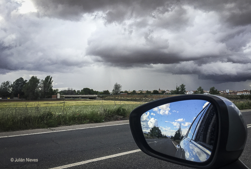 Imagen publicada en el programa del tiempo Castilla la Mancha Televisión, realizada en la tarde del Viernes con un tf Iphone 6, es curioso como por el retrovisor se capta una imagen muy distinta de la parte frontal, llamándome muchísimo la atención y que no podía dejar de pasar, siendo este el resultado a pesar de estar realizada con un tf móvil.