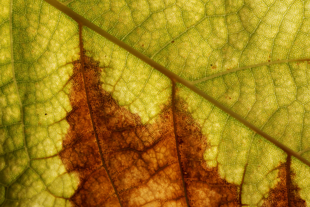 Un fragmento de hoja vestida de colores otoñales.