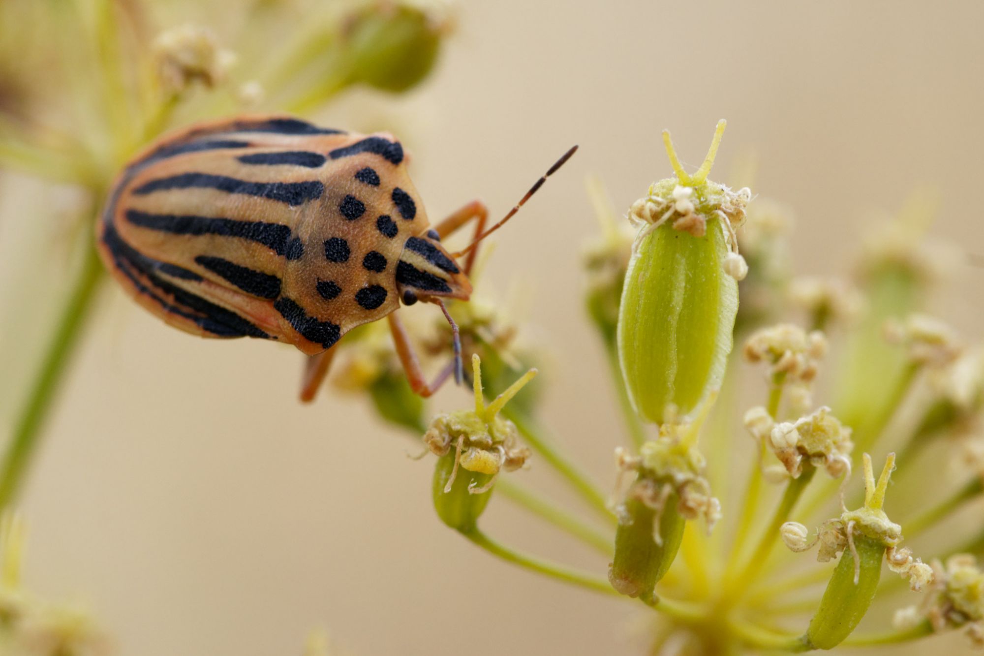 Para Gregorio: se trata probablemente de Graphosoma semipunctatum, especie subordinada a las grandes umbelíferas del arco mediterráneo.
