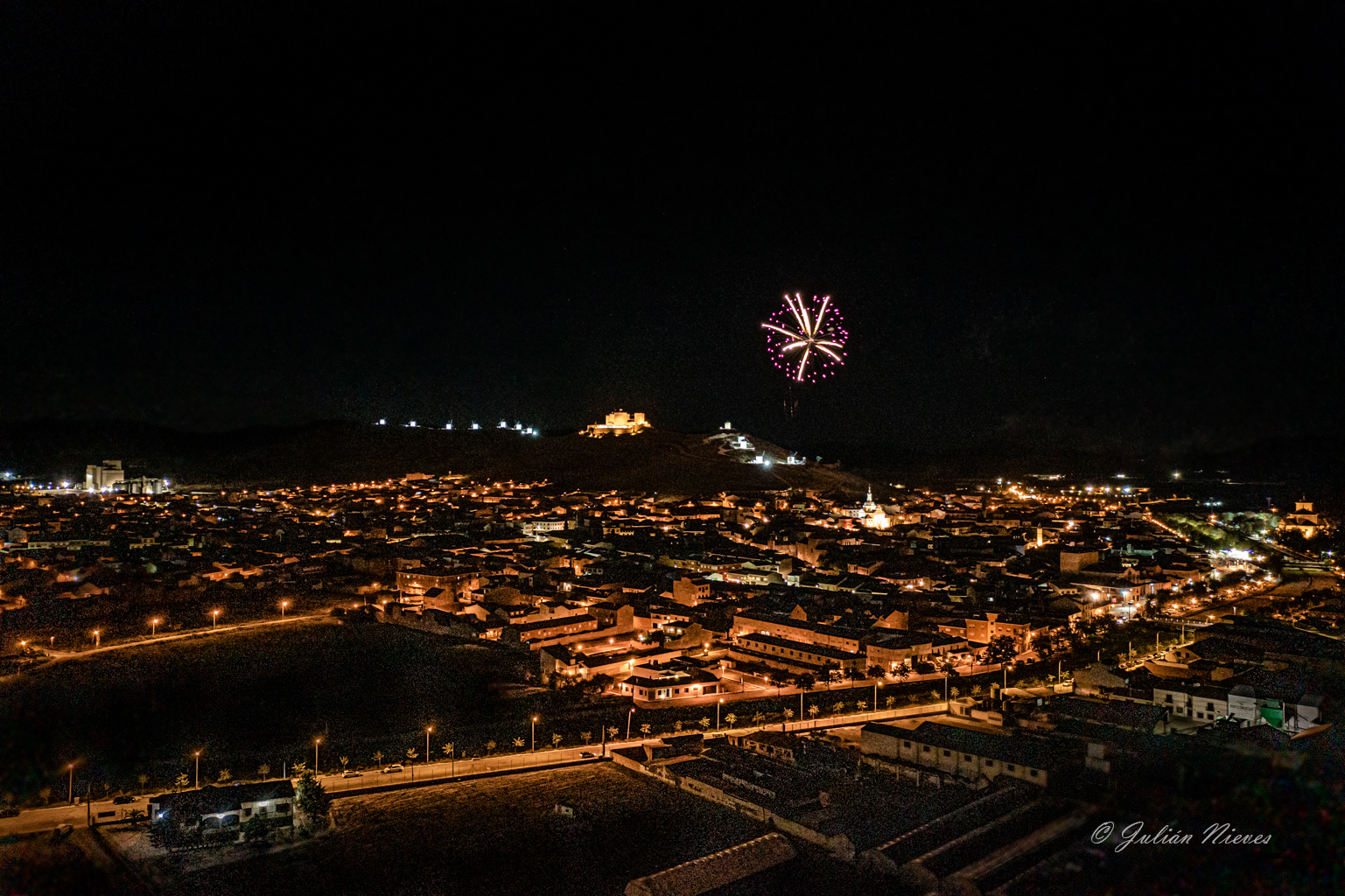 A vista de dron Mavic 2 Pro el pueblo de Consuegra y fuegos artificiales, esta vez la velocidad más baja probando el disparo buscando conseguir estelas y buena nitidez a 1/10 - f 2.8 - ISO 1600, seguiré bajando a ver que se puede conseguir y donde puedo llegar.