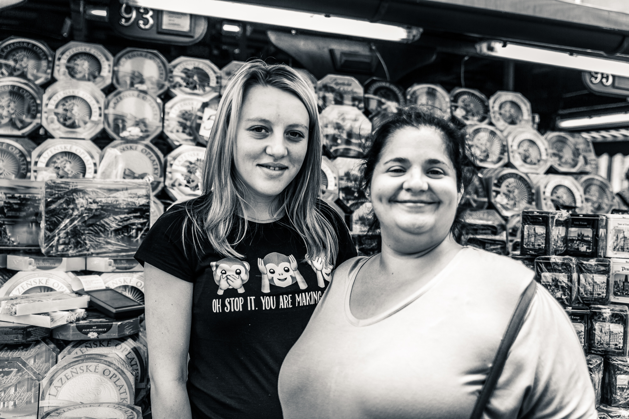 Sonrisas opuestas, es el fruto de un retrato de dos personas que posan para una foto sin conocerse de nada, ninguna de las dos ha cruzado ni una sola palabra entendible con la otra, no conocen ni sus nombres. La compradora de unos souvenirs pide una foto con la vendedora del tenderete en el mercadillo. Una orgullosa de conseguir la foto de recuerdo de su viaje y la otra complaciente con una sonrisa forzada por haber conseguido vender unas cuantas cosillas para rematar el día.