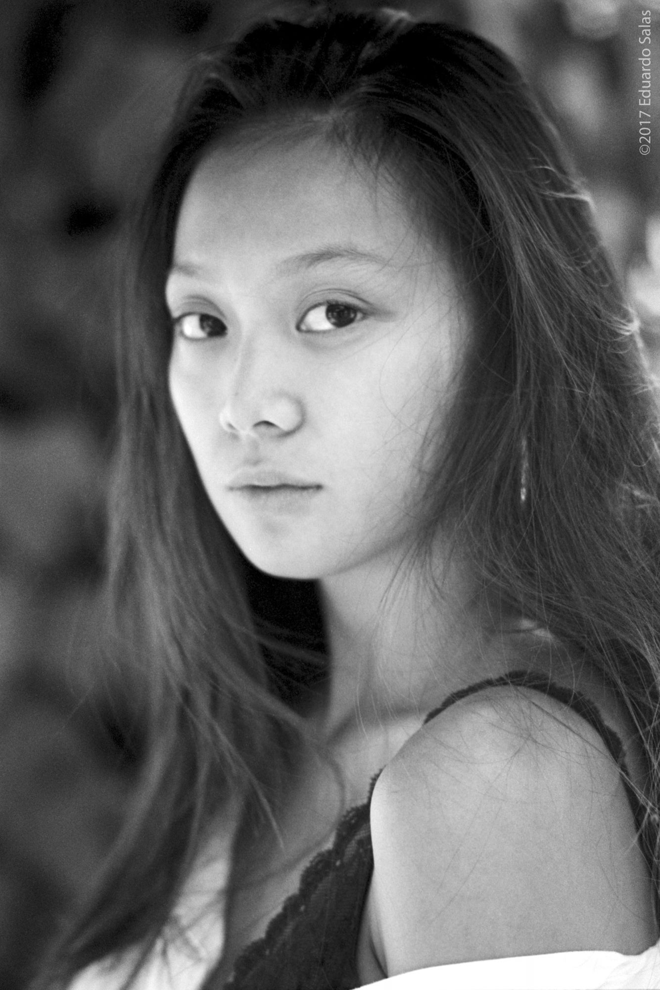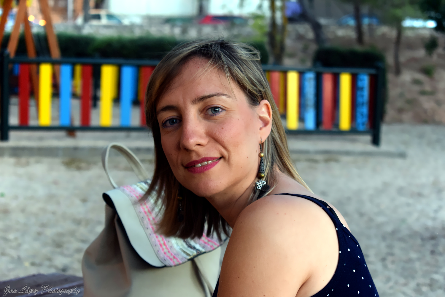 El gesto de ella es precioso, la luz muy bien controlada y expuesta, te dejo mi opinión, es solo eso, una opinión personal, si usas formato horizontal en un retrato, los ojos deben de ir lo mas arriba posible y el sujeto no debe estar en el centro de la foto, el bolso de color claro distrae mucho y el fondo a colores verticales también.