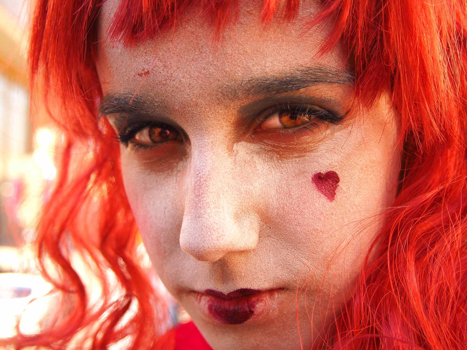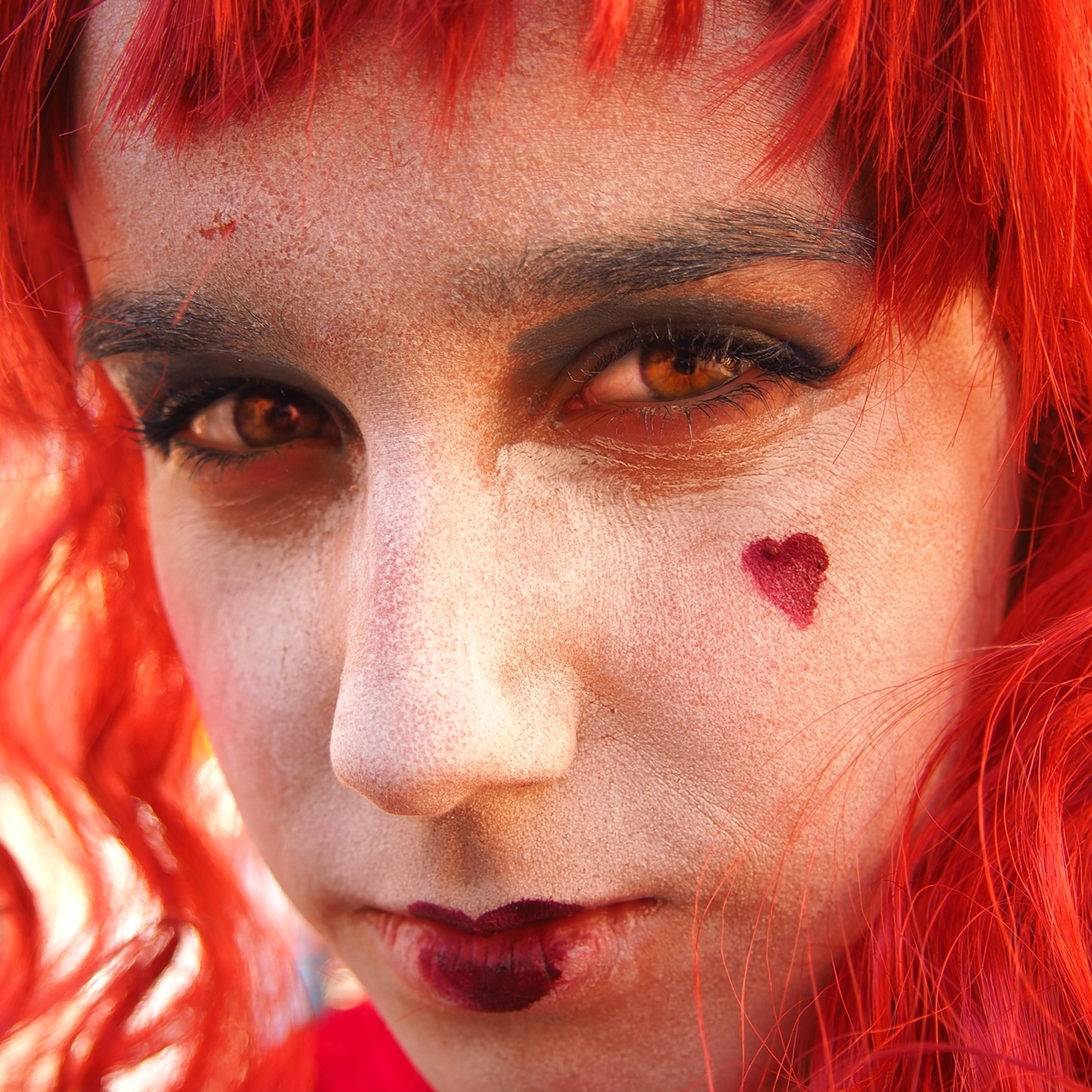 Si te fijas existe una diagonal muy marcada entre la esquina superior izquierda e su opuesta abajo a la derecha. Esa línea divida la foto en dos, pon un lado el ojo derecho del modelo que se queda más atrás, como más oculto, deja también los labios carnosos de ese lado, medio pintados con un rojo corazón. En la otra parte tenemos el ojo más cercano, más claro, más sincero? y el otro corazón, dibujado aquí como un lunar pequeño. Remata el conjunto, lo que también señalas, compañero, la mirada penetrante, como si quisiera llegar hasta dentro de quien tiene enfrente, como si buscara algo, tal vez el alma. Cuánta intriga y qué cosas tiene el Carnaval