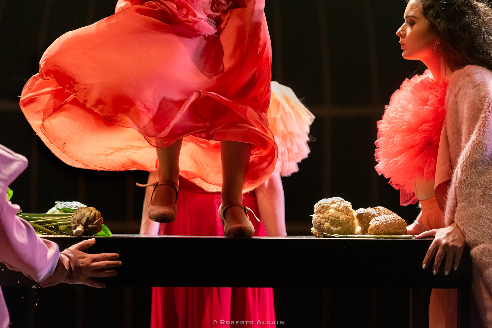Una escena de la ópera "La mujer tigre" (Manuel Busto, 2021). Una co.producción del Teatro de la Maestranza y del Teatro Lope de Vega. Reyes Carrasco, cantaora, y Paula Comitre, bailaora.