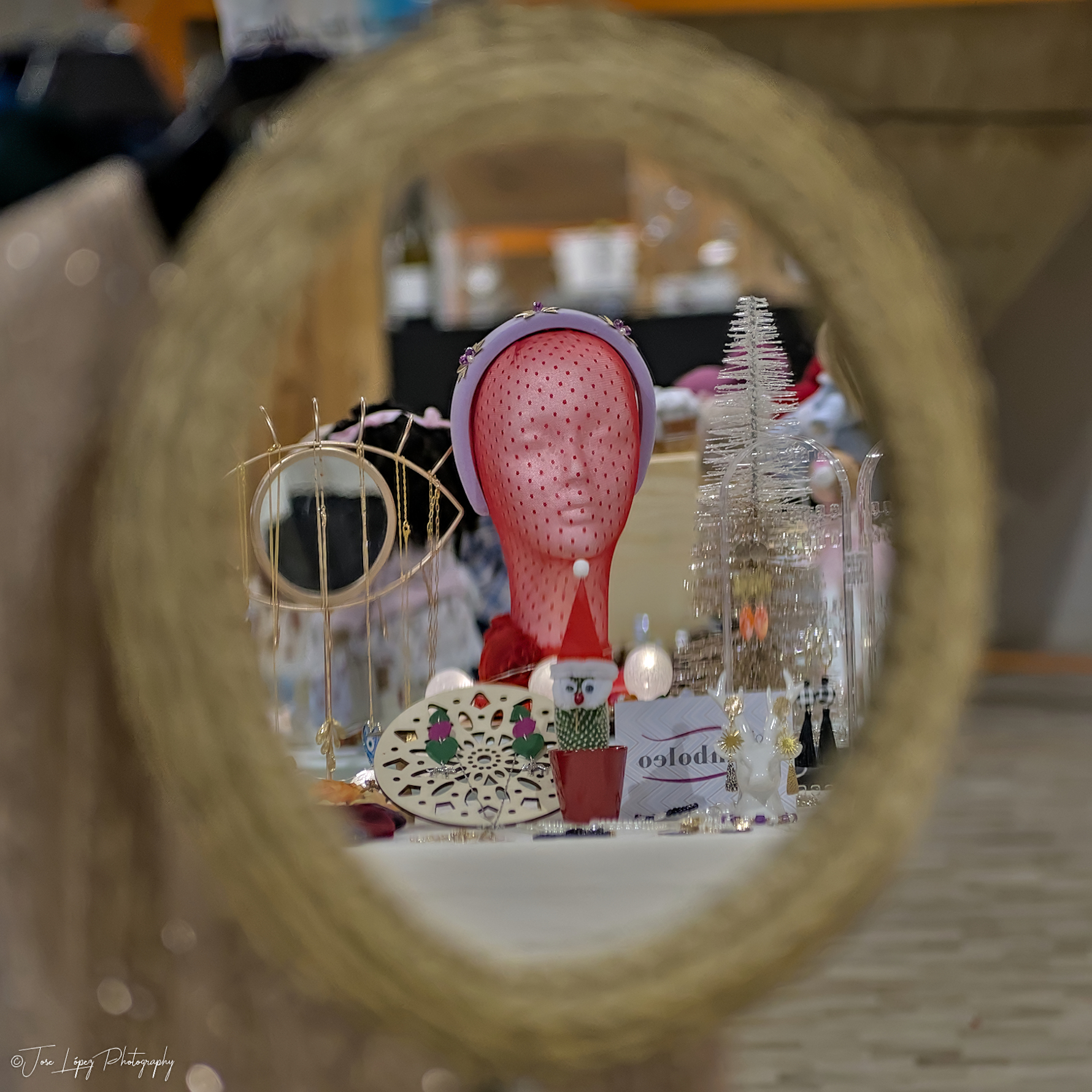 Lo digo porque veo un bodegón reflejado en el espejo, bien desenfocado para dar protagonismo, todo muy bien colocado, quizá demasiado, un ojo, una cabeza de maniquí, el papá noel justo en el centro del maniquí el resto de elementos digo yo que algo aportarán, pero no lo descifro el enigma, por eso pregunto....
