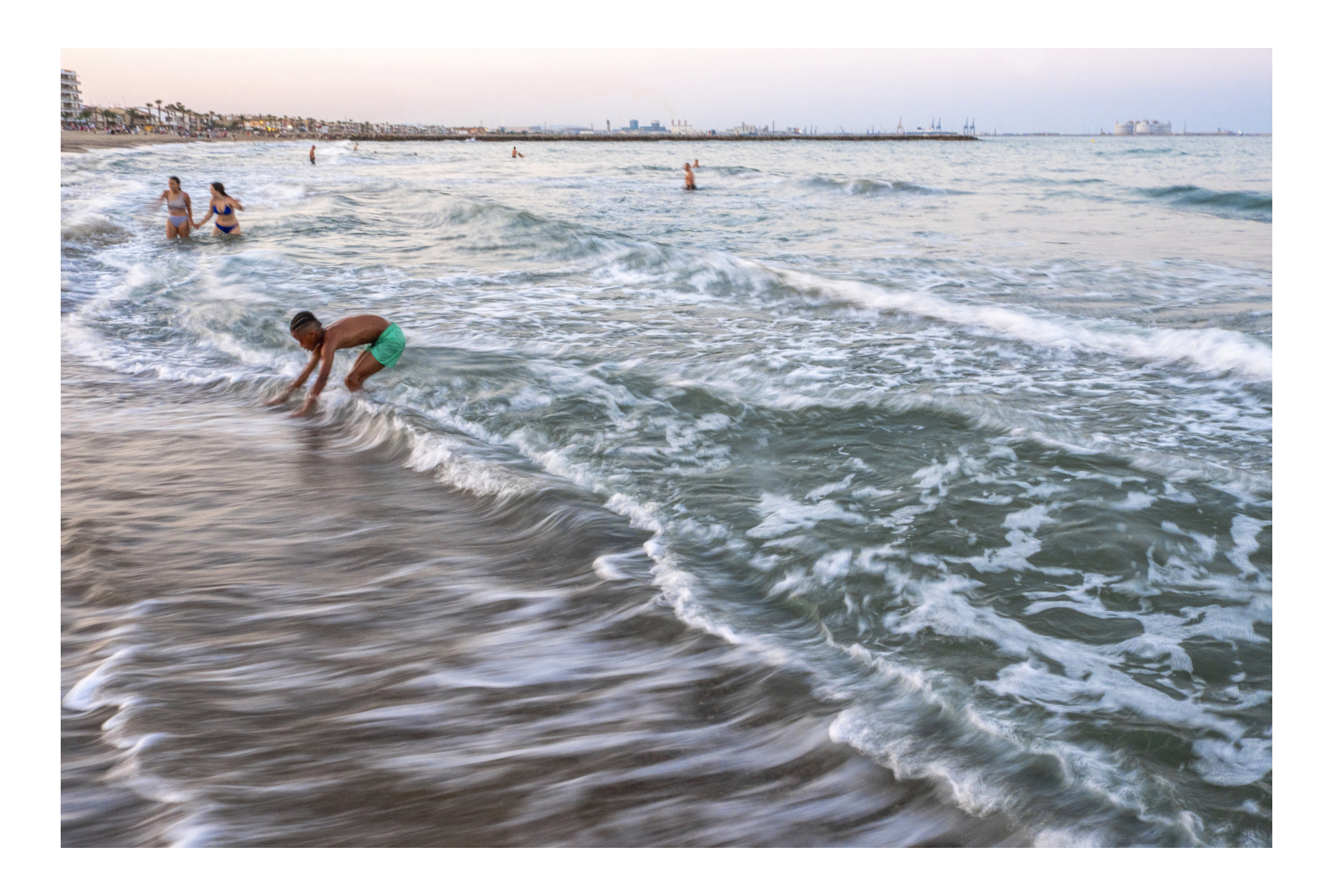 Por lo general veo que vuestros puntos de vista se centran en la composición y coincidís en reencuadrar para o bien prescindir de mar o prescindir de las personas que acompañan en la foto al niño. A la hora de hacer la foto se incluyó deliberadamente la línea del horizonte y algunas personas, al mismo tiempo que se añadía una importante porción de mar a la derecha todo a modo de darle algo de contexto a la imagen. De haber prescindido de mar añadido más a la izquierda habría quedado demasiado saturado de personas pues a la izquierda ya había bastante más bañistas en la orilla y de haber reencuadrado dejando solo al niño habría sido un foto con más tendencia al pictorialismo puro (aunque algo de ello tiene con el efecto logrado en el agua), lo cual no encajaba con mi idea a la hora de tomar la foto. Como resultado es lo que es, una foto resultona poco más, valga la redundancia.