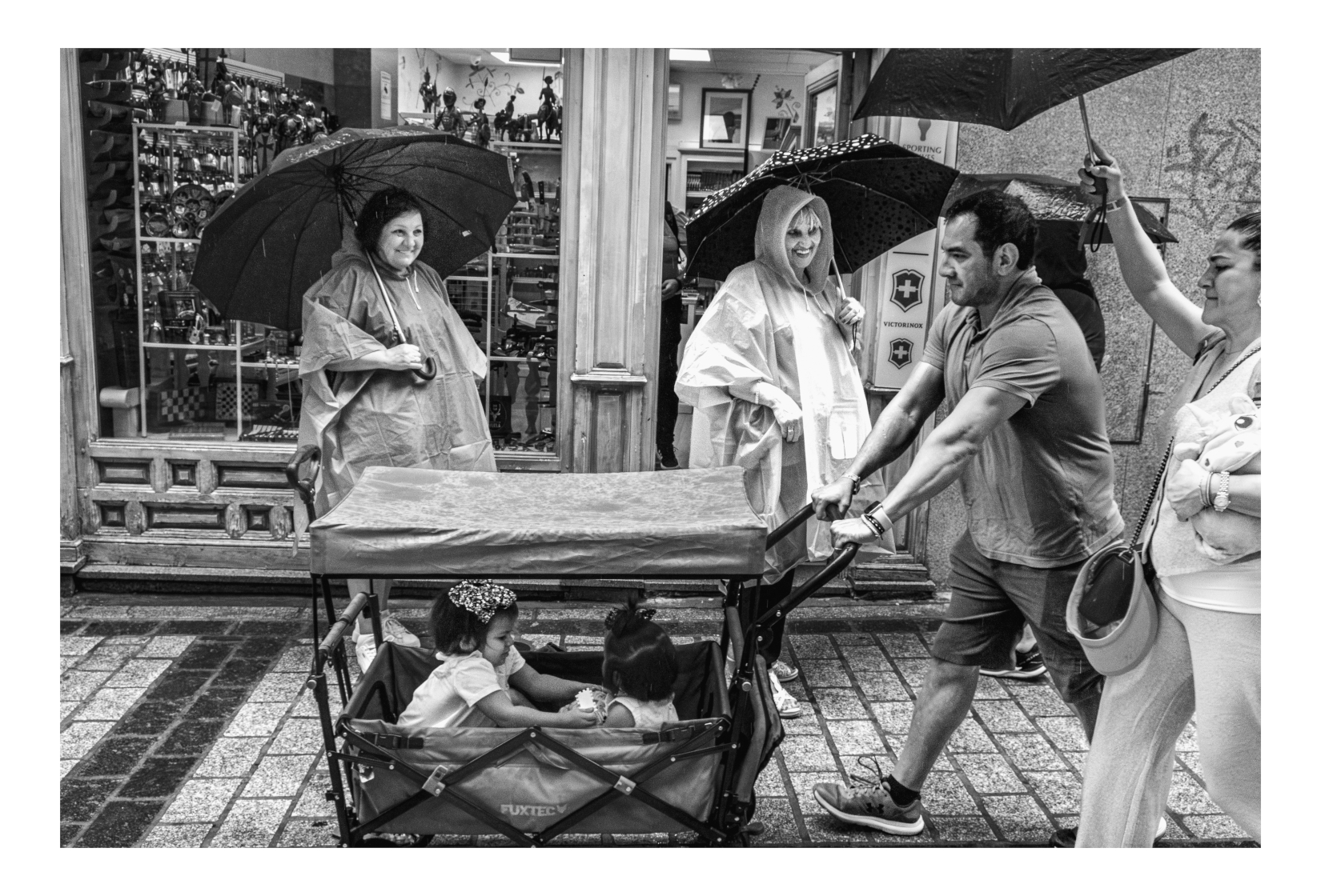 Entiendo lo que comentas Eduardo. Personalmente este encuadre con la mujer así gana en dinamismo ya que visualmente se acentúa la sensación de que la mujer está entrando en la escena, algo que se ve favorecido además por la postura de su brazo alzando el paraguas en su afán por cubrir a quién supongo que es su pareja.