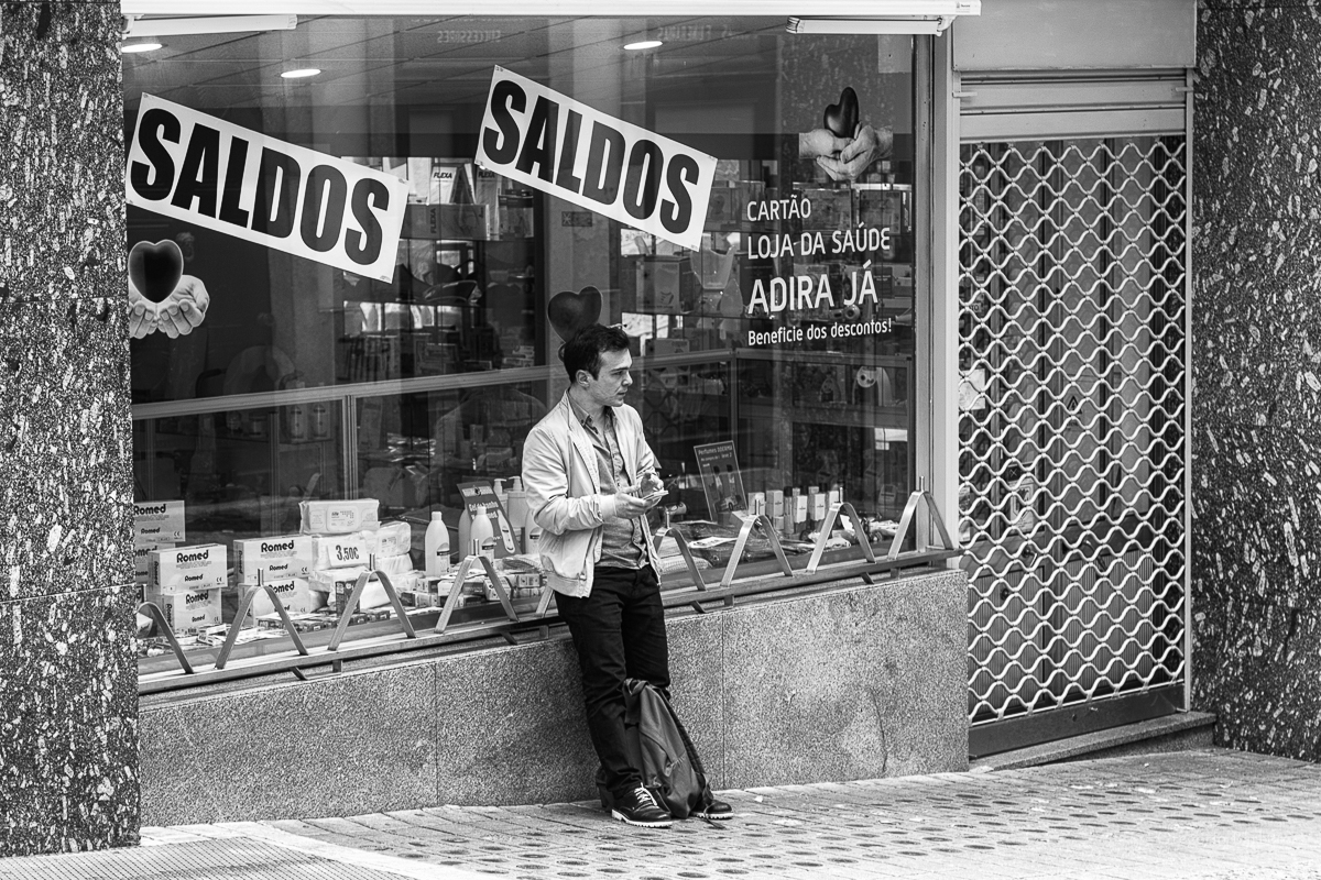Mensaje, confuso yo cuando mire la primera vez digo bueno, una tienda de saldos de Portugal y uno apoyado en la pared, pero después de mirarla varias veces digo, lo mismo Gregorio a querido transmitir que el chico apoyado esta esperando que abran la tienda para hacerse con algún saldo, quizás sea eso.