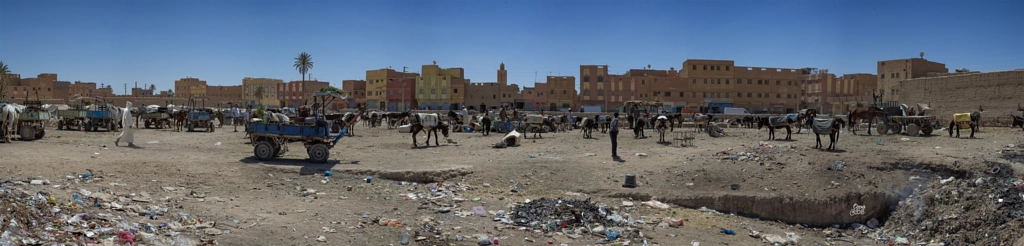 Esta es una panorámica de 7 fotos en vertical, que intenta reproducir TODO el ambiente que hay en una de las plazas del mercado de Risani, en el sur de Marruecos, cerca de la frontera con Argelia.