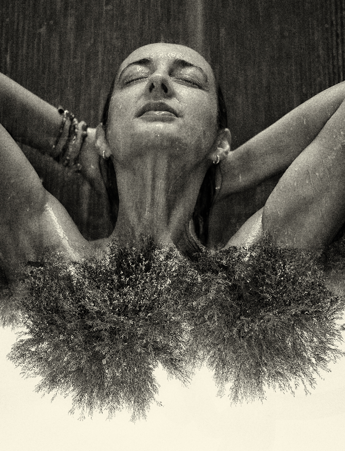 doble exposición, utilizando una fotografía que hice a una modelo en la ducha y otra de una toma que hice a un olivo centenario.