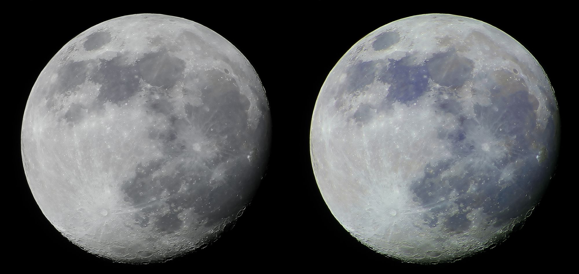 Mi primera foto de la Luna con un telescopio refractor Explorer Scientific f/7 de 714 mm. + Barlow 2x. Para obtener esta fotografía se filmó en HD durante 5 minutos, este video se procesó posteriormente en Pipp y Registax, el color de la imagen derecha se obtuvo con PS tratando de emular el color de los minerales existentes en nuestro satélite: basaltos ricos en titanio, andesitas y rocas meteóricas.