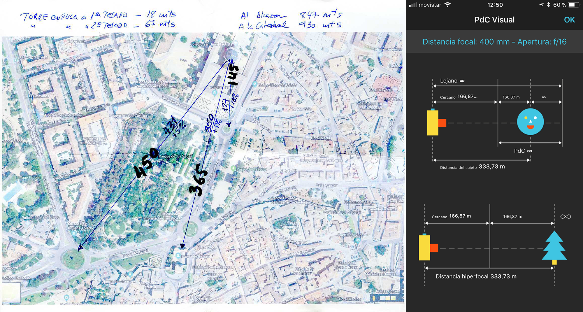 Sí comentar algo de las propias tomas. En esta técnica no puede existir ningún automatismo, todos los ajustes de cámara son manuales. Por ello y dado el mal tiempo que había, tuve que esforzarme en optimizar al máximo la hiperfocal. Para ello me preparé antes las distancias exactas medidas con Google Earth Pro y ajusté mediante el Photopills con la mayor precisión de que fui capaz.