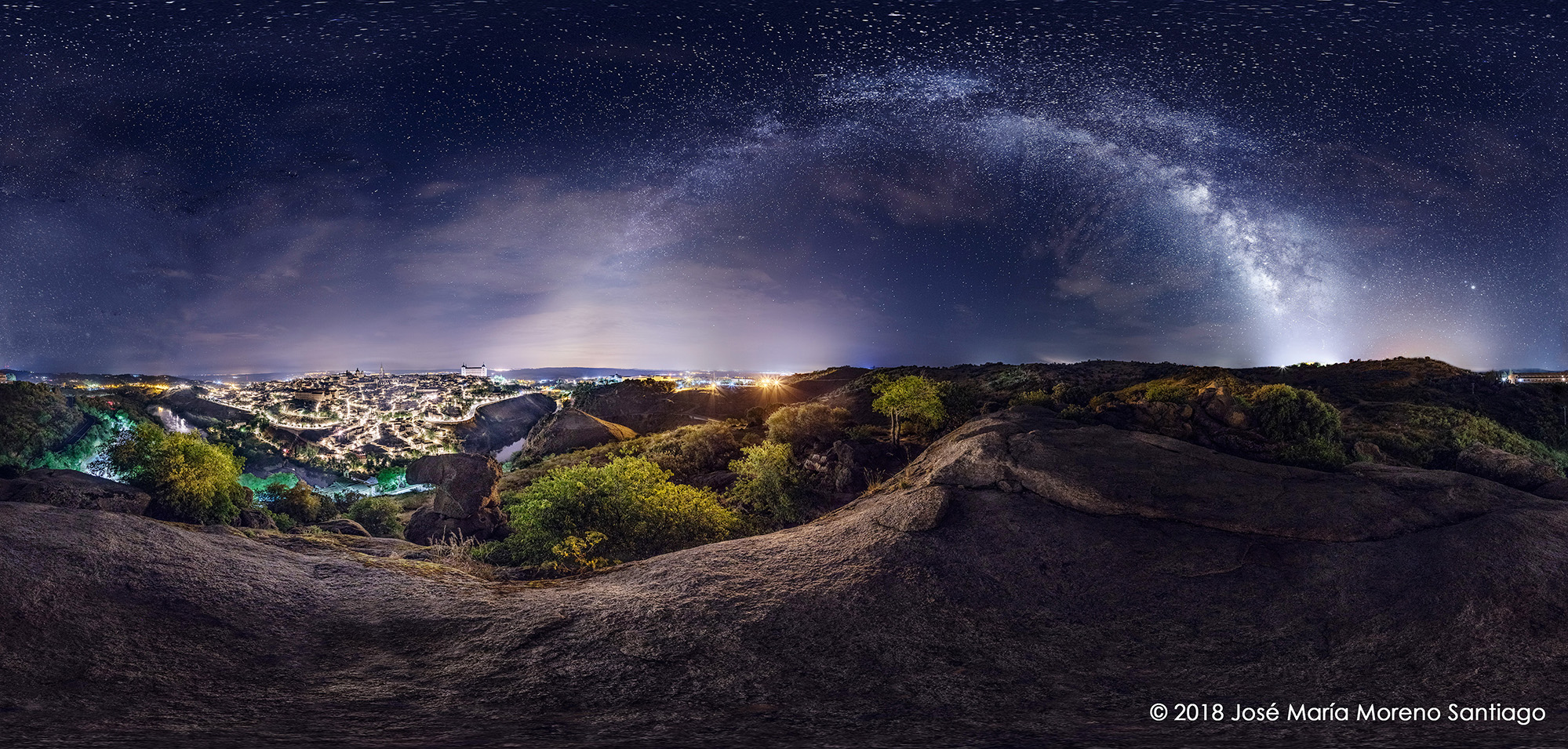 Si no estoy equivocado, creo que es la primera vez que se fotografía la Vía Láctea completa sobre la ciudad. La gran contaminación lumínica que existe en Toledo la vuelven enormemente esquiva y débil. Tengo entendido que la luces del propio Madrid contaminan una distancia de hasta 300 kilómetros. .