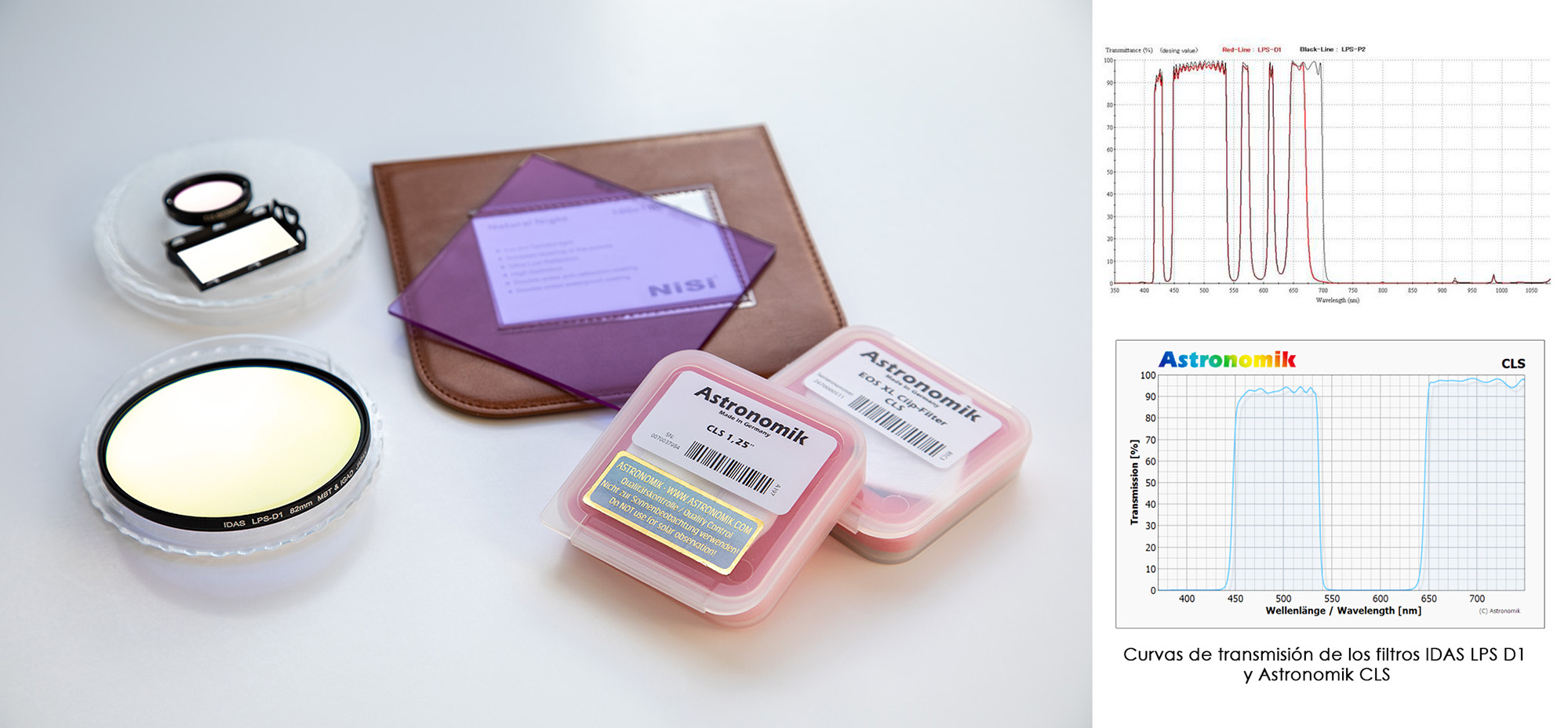 Existen varios fabricantes (no muchos) y pueden colocarse de tres formas: delante del objetivo, detrás de él y junto al sensor. Si se colocan delante del objetivo no pueden usarse focales inferiores a 35 mm, pues están pensados para telescopios y en los grandes angulares los rayos circundantes provocan enormes distorsiones cromáticas, por lo que si se emplean angulares es preferible usarlos detrás o junto al sensor. En ese caso cuidado con no dañar las lentes, el espejo o el propio sensor. Lo digo con conocimiento de causa :). Existe una excepción en el filtro Nisi Night que puede usarse sin problema delante pero no es tan eficaz como los otros. Su factor de exposición está entre 2x y 8x y hay que compensar entre 1 y 2 pasos normalmente.