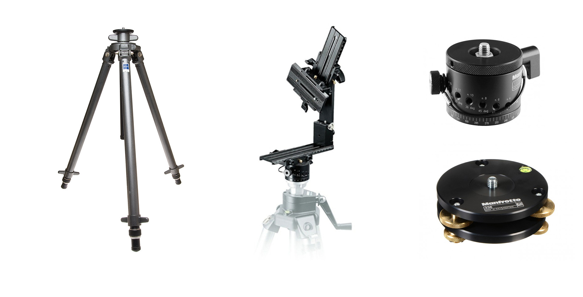 Cabezal panorámico Manfrotto 303 SPH, Base niveladora 338 y repartir de ángulos 300N. Sobre el cabezal se taró la pupila de entrada de los objetivos exactamente en el centro de giro, tanto en el eje vertical como en el horizontal.