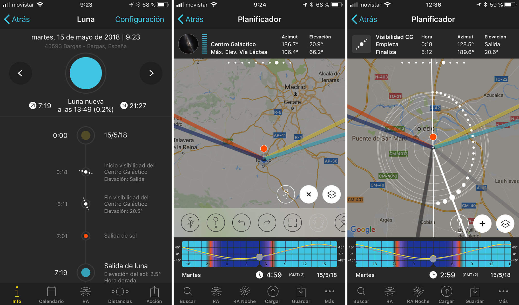 Mediante el PhotoPills se planificó la sesión anticipadamente ya que esta fantástica APP te permite prever a voluntad la situación que puedes tener cuándo y dónde quieras y a excepción de las condiciones meteorológicas, que obviamente pueden ser cambiantes, su precisión es asombrosa y la realidad coincide exactamente con las previsiones.