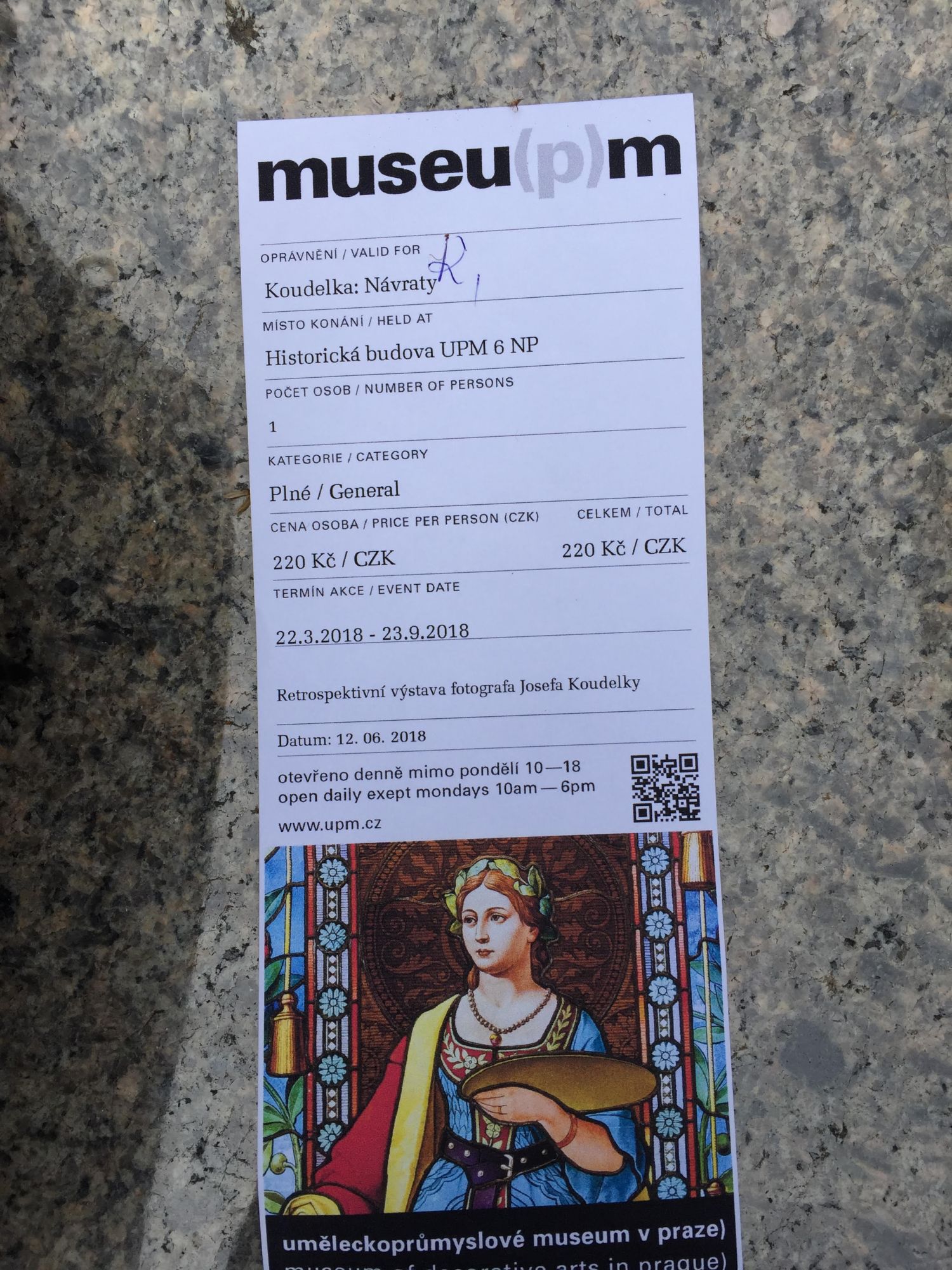 Me dirigí hacia un banco de granito en el que había sentado un señor en el centro, el cual al ver que me dirigía hacia él amablemente se desplazó a un lado para cederme parte del asiento. Entonces me quité la mochila de la fotografía, y con mucha parsimonia coloque mi entrada sobre el banco, la cual estaba totalmente lisa sin un solo doble, pues la había guardado en el folleto de la exposición; me dispuse a hacer la foto mientras el viejete que llevaba colgada una cámara analógica, me miraba sin parpadear. Cuando termine de hacer la foto, me senté un momento a su lado y comenzó a hablarme en Inglés, idioma que no entiendo pero como es tan universal es el que la gente mas practica cuando se cruza en el extranjero, no le entendí prácticamente nada de lo que me dijo, pero si le dije en español y en espanglish mis impresiones de la exposición, los dos sonreímos, y poco después el se levanto y se dirigió hacia el interior del museo. Allí termino mi visita al museo.